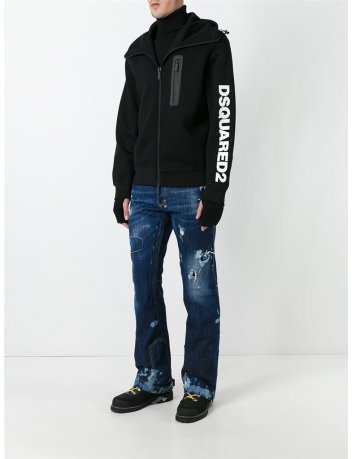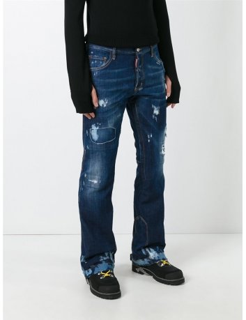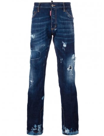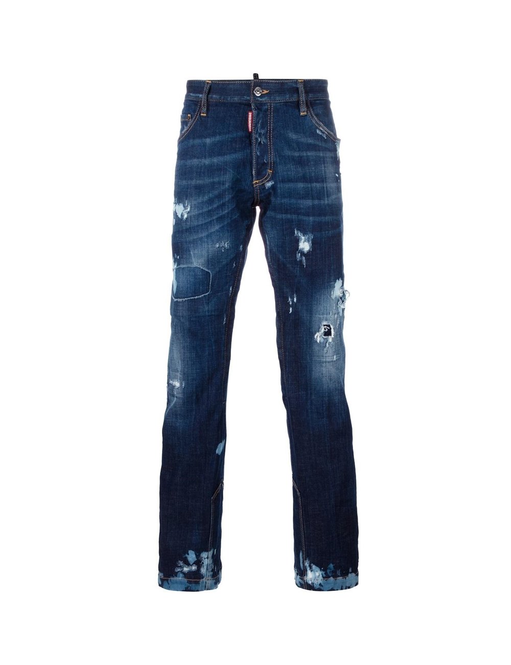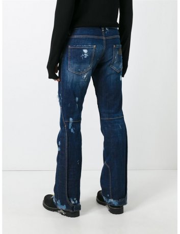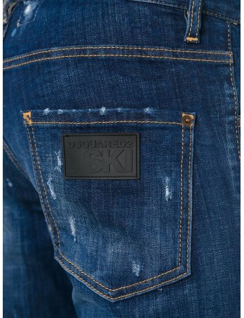 Jean de ski évasé en coton stretch bleu effet délavé et usé avec braguette boutonnée, passants de ceinture à la taille, coupe classique