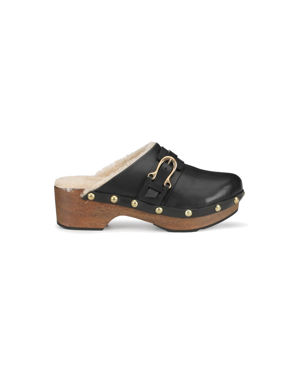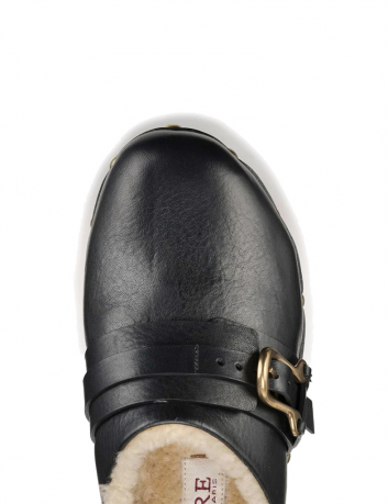 Sabots en cuir fourrée, mouton, boucle et clous dorés, Sartore.